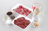 鍋にレバー、砂肝、ショウガ、酒、水を入れて火にかける。