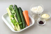 ニンジンは皮をむき、キュウリに合わせて切り、熱湯でゆで水に取り粗熱を取る。