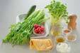 貝われ菜は根元を切り落とし、水洗いして2等分の長さに切り、水菜と合わせる。プチトマトはヘタを取って水洗いする。