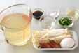 鍋にだし汁を入れて強火にかけ、煮立てば<調味料>、エノキ、ミョウガを加える。