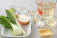鍋にだし汁を温め、玉ネギ、チンゲンサイ、白ネギ、油揚げを加え、煮立てば<調味料>を加える。