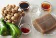 ピーマンは縦半分に切り、ヘタと種を取り、コンニャクの大きさに合わせて、ひとくち大の乱切りにする。
