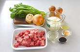 レンコンは皮をむいて4等分の輪切りにして、水に放つ。