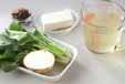 ほうれん草は根元を切り落としてきれいに水洗いし、2cmの長さに切り、ザルに上げる。