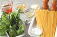 スパゲティをゆでる熱湯に塩を入れ、スパゲティを加え袋の指定時間より30秒短い時間ゆで、ザルに上げてゆで汁を切る。