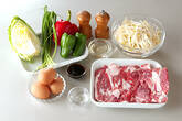 フライパンにサラダ油を加え、豚肉をほぐしながら炒める。色が変わってくれば太モヤシ、キャベツ、ピーマン、パプリカを加えて炒めあわせる。全体にしんなりすれば細ネギを加えてサッと炒めあわせる。