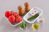 トマトは熱湯に入れ、皮がはぜれば冷水に取って皮をむく。水気を拭き取り、上から2cm位の所を横に切り、スプーンで種と果肉を取る。トマトのカップはザルに伏せて冷蔵庫で冷やしておく。果肉は1cm角に切る。