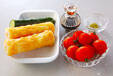 ちくわの穴にキュウリを差し込み、1cm幅に切ってプチトマトと盛り合わせる。お好みでワサビじょうゆをつけていただく。