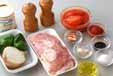 玉ネギが透き通ってくれば、マッシュルームを加えて炒めあわせ、<ソース>の水煮トマトを手でつぶしながら加え、他の材料も加える。
