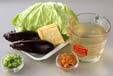 鍋にだし汁を入れて強火にかけ煮立ったらナス、キャベツ、油揚げを加え、再び煮立ったら火を少し弱め、3分煮る。
