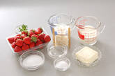 イチゴは水洗いし水気をきってヘタを取り、耐熱ボウルに入れてグラニュー糖をからめる。ラップをかけずに電子レンジで4分加熱し、生っぽい場合は軽く混ぜて更に30~40秒加熱する。