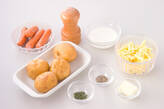 ジャガイモは皮ごときれいに水洗いし、ぬれたままラップで包み電子レンジで4~5分加熱(途中方向を変える)する。竹串がス~ッと刺されば、タオル等で包みながら皮をむく。