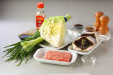 ボウルに豚ひき肉、キャベツ、ニラ、白ネギ、<合わせ調味料>の材料をよく混ぜ合わせる。
