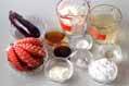 タコ、ナスは小麦粉をしっかりまぶしつけ、<衣>をからめて170℃の揚げ油に入れる。サックリと揚げ、油をきる。