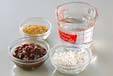 鍋に葛粉、水、ゆで小豆を入れ、木ベラでよく混ぜ、完全に溶かして中火にかける。少し固まってきたら弱火にして更に混ぜ合わせ、火からはずしたり火にかけたりしながら練り混ぜる。