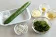 キュウリは両端を切り落として縦縞に皮をむき、薄い輪切りにし塩少々をからめ、しんなりすればサッと水洗いし水気を絞る。