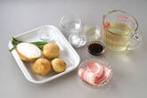 鍋に水切りしたジャガイモ、玉ネギ、だし汁、酒、みりん、砂糖を入れて中火にかけ、煮立てばベーコンを加え、クツクツ煮立っている位の火加減で10分煮る。
