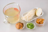 鍋にだし汁を入れて強火にかけ、煮立てば玉ネギ、エノキを加え、玉ネギがしんなりすれば、みそを溶き入れる。