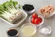 貝われ菜は根元を切り落とし、水洗いし長さを半分に切る。○プチトマトは水洗いし、ヘタを取って縦半分に切る。