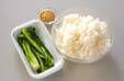 炊きたてご飯に野沢菜を混ぜ合わせ、炒った白ゴマを加え更に混ぜ合わせて、器によそう。
