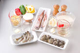 フライパンにサラダ油、バター10gを熱し、ニンニク、玉ネギを炒める。イカ、エビ、アサリ、コーンを加えて更に炒め、塩、コショウする。