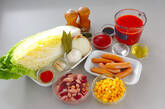 白菜の葉、水煮豆、水煮コーン、ローリエ、<合わせ調味料>も加え、ヒタヒタまで水を加え、強火にする。