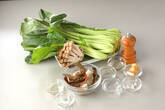 エビは殻と背ワタを取り除き、塩水でかるく洗って水気を拭き取り、<下味>につけて軽くもみこんでおく。小松菜は水でよく洗い、根元を切り落として4cm長さに切り、水気を切っておく。シメジは小房に分ける。