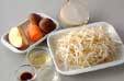 モヤシは根を取ってたっぷりの水につけ、パリッとすればザルに上げる。