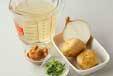 鍋にだし汁、ジャガイモ、玉ネギを入れ強火にかけ、煮立てば火を弱める。
