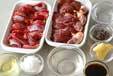 鍋にレバー、砂肝、ショウガ、酒、水を入れて火にかける。