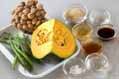 カボチャは種とワタを取り除いて皮を所々削ぎ落とし、食べやすい大きさの薄切りにする。