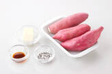 サツマイモが熱いうちに両端を切り落として2cm幅の輪切りにし、バター、しょうゆをからめる。仕上げにゴマ塩を振りかけ、器に盛る。