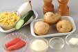 ジャガイモは皮ごときれいに水洗いし、ぬれたままラップで包み、電子レンジで6~7分(途中で向きを変えて)加熱し、竹串がス~ッと刺さる位まで加熱する。