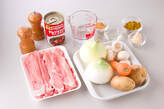 鍋にサラダ油、ニンニクを中火で熱し、香りが立ってくれば豚肉、玉ネギ、水気を切ったジャガイモ、ニンジン、マッシュルームの順に炒める。