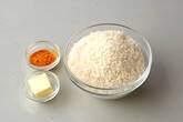 フライパンにバターを入れて中火にかけ、バターが溶ければ洗い米を加える。お米が透き通るまで炒める。