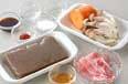 フライパンにゴマ油を強火で熱し、コンニャク、豚肉、シメジ、ニンジンを炒める。