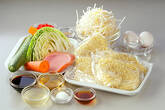 キャベツはせん切りにして冷水に放ち、パリッとさせてザルに上げる。