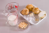 鍋にジャガイモ、玉ネギ、バター、牛乳、水、固形ブイヨン、塩を入れて中火にかけ、煮立てば、火を弱めて10~12分煮る。(ジャガイモに竹串がス~ッと刺さればO.K.です。)