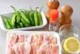鶏肉とシシトウを盛り合わせ、レモンを添える。レモンを絞り、好みで一味唐辛子を振り掛ける。