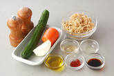 キュウリは縦縞に皮をむき、薄い輪切りにしてサッと水を通しておく。