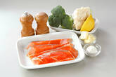 フライパンにバターを中火で溶かし、盛り付けた時に表になる側からサーモンを並べ入れる。時々フライパンをゆすって両面色よく、美味しそうに焼く。器に盛り付け、ブロッコリー、カリフラワー、レモンを添える。