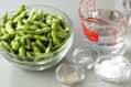 サヤ付きの枝豆はハサミで両端を切り落とし、よく水で洗い、水気を切ってボウルに入れ、分量外の塩大さじ2ぐらいでよくもむ。煮立ったタップリの熱湯に枝豆を塩ごと入れ、再び煮立てば3分ゆでる。ザルにあげて流水で冷やし、サヤから枝豆を取り出し、薄皮もむく。(サヤ付枝豆260gでむき枝豆120gです。)