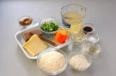 鍋にだし汁、<調味料>を入れ、ミツバ以外の具を加えて火にかける。煮立ったら火を弱めて2~3分煮てザルに上げ、具と煮汁に分ける。
