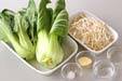 中華鍋又はフライパンににサラダ油を強火で熱し、ショウガを炒め、香りが立ってくればチンゲンサイ、モヤシを加えて手早く炒めあわせる。