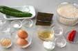 タラコ、キュウリ、白ゴマを混ぜ合わせ、器によそい、錦糸卵、刻みのりをのせる。