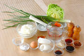 冷凍コウイカは常温に戻して1cm角に切る。ニンジンは皮をむき、粗めのみじん切りにする。インゲンは塩をまぶしてまな板の上で転がし、軸側を少し切り落として1cm長さに切る。白ネギは粗いみじん切りにする。細ネギは2cm長さに切る。レタスは3~4cm長さのせん切りにして水洗いし、しっかり水気を切る。炊きたてご飯に卵を溶いて混ぜ合わせる。