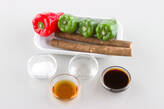 ピーマン、赤ピーマンは縦半分に切ってヘタと種を取り、縦に細切りにする。