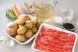 肉の色が変われば、ジャガイモ、玉ネギ半量、手綱コンニャクを加えて炒め合わせ、全体に油が回れば、ひたひたのだし汁を加える。