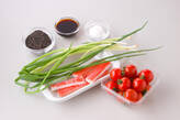 <合わせゴマダレ>にプチトマト、カニカマボコを加えてサッと和え、薬味ネギを加えて合わせ、器に盛る。