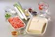 中華鍋にサラダ油を熱し、白ネギ、ショウガ、ニンニク、豆板醤を加え、香りが立てば豚ひき肉を加え、ポロポロになるまで炒め合わせる。